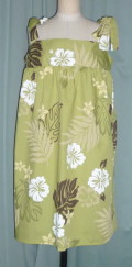 オリジナルブランドAuliiHaupiaのキャミソール チュニックです。素材:ポリエステル65%、コットン35%、サイズ:11号(ML)、長さ:75cm、柄:ハイビスカス柄。両肩をリボンで結び、下からかぶるタイプのチュニックです。